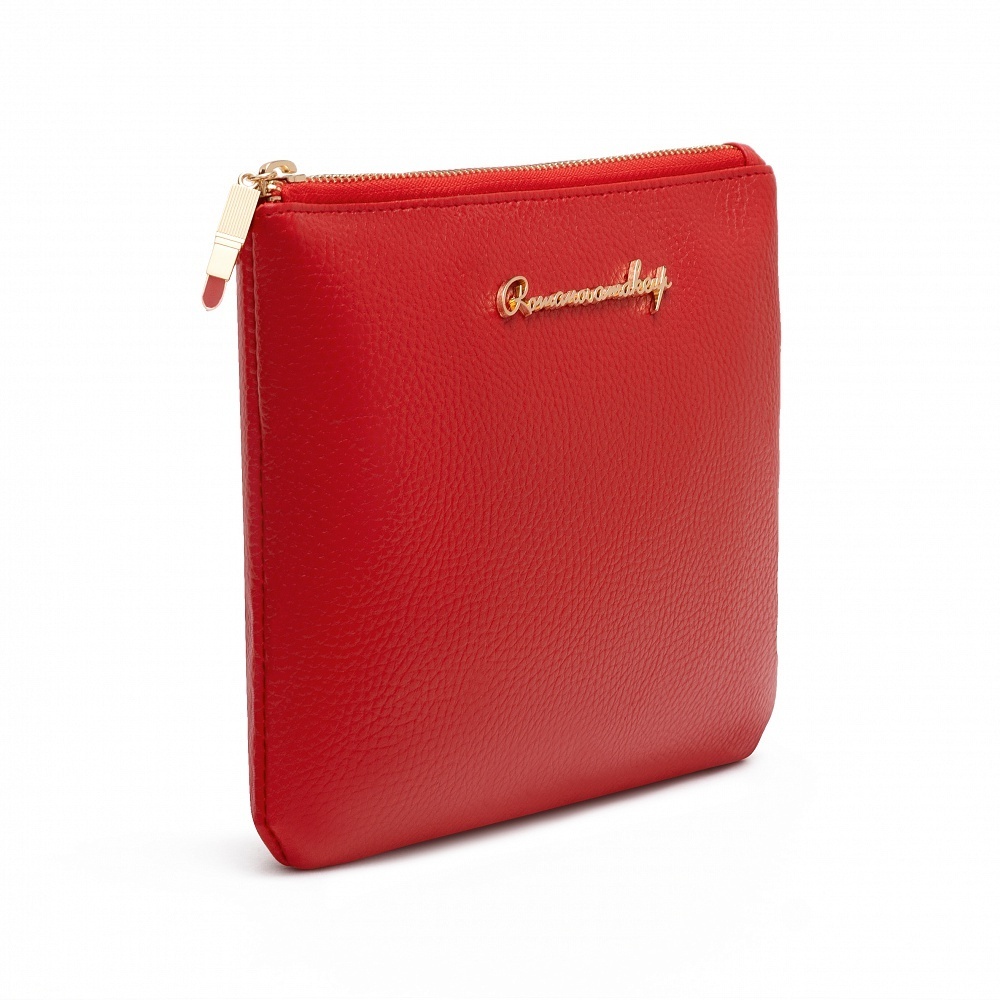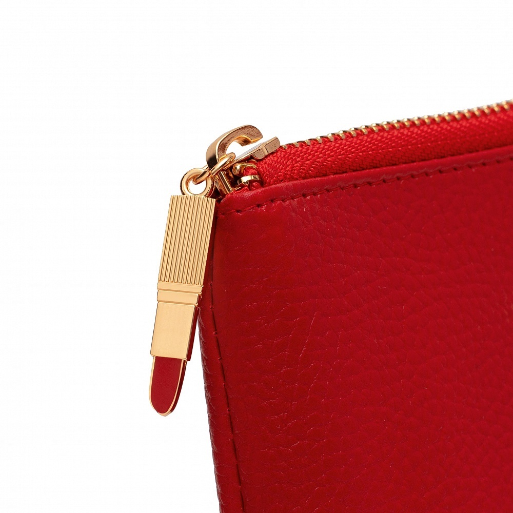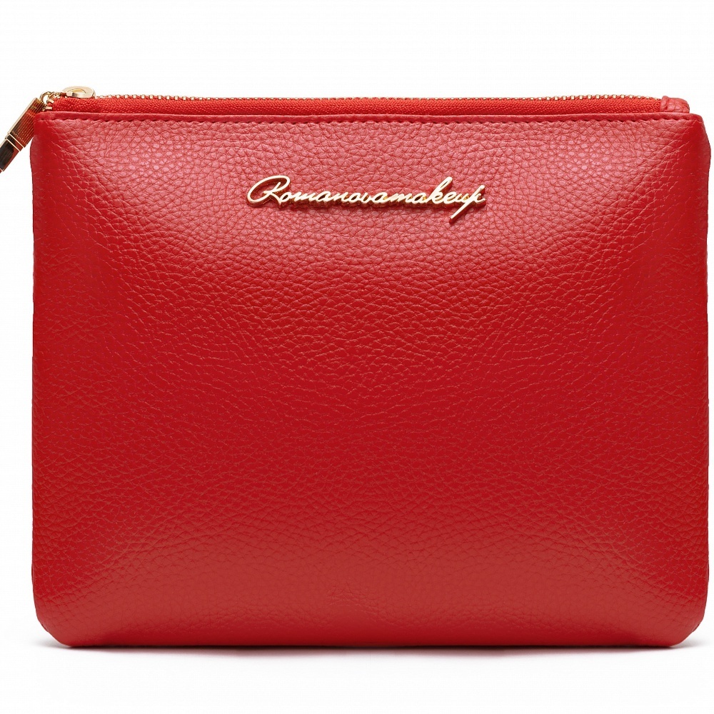 Косметичка выполнена из экокожи в фирменном красном цвете.