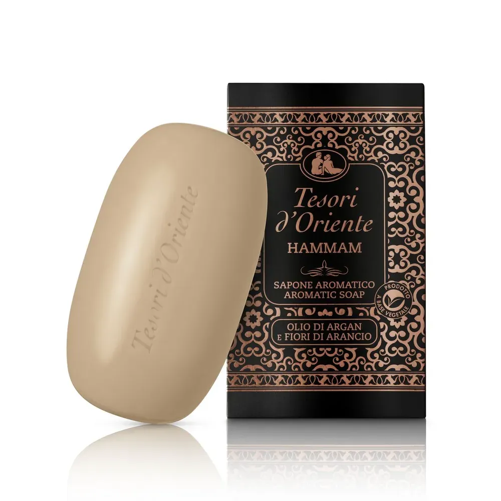 Мыло твердое Tesori D’oriente Хаммам создано на основе натуральных масел. Содержит драгоценное аргановое масло и масло миндаля, дополнено изысканными нотами цветка апельсина. Подходит не только для рук, но и тела.