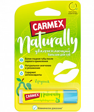 CARMEX Naturally Груша – натуральный бальзам для губ, который действительно работает! Его интенсивная увлажняющая формула более чем на 95% состоит из натуральных ингредиентов. Клинически доказано, что он заметно разглаживает и смягчает губы после первого применения. Мы добавили масла из плодовых косточек, богатые антиоксидантами, экологически чистые масла купуасу и мурумуру, а также дозу коллоидной овсянки, которая успокаивает и разглаживает губы - и все это в быстро впитывающейся формуле, которая точно понравится Вашим губам!